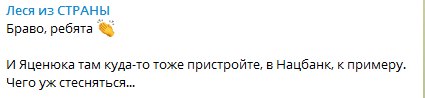 "Браво, ребята! И Яценюка там куда-то тоже пристройте, в Нацбанк, к примеру. Чего уж стесняться..." - отреагировала ведущая блога "Ясно-Понятно" Олеся Медведева.