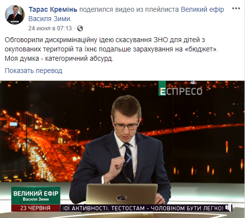 Не так давно Креминь выступал против инициативы Владимира Зеленского об отмене ВНО для детей с неподконтрольных территорий. В этом году из-за карантина и перекрытых блокпостов дети из неподконтрольного Донбасса могут поступать в вузы без тестов - по квотам и результатам вступительных экзаменов.