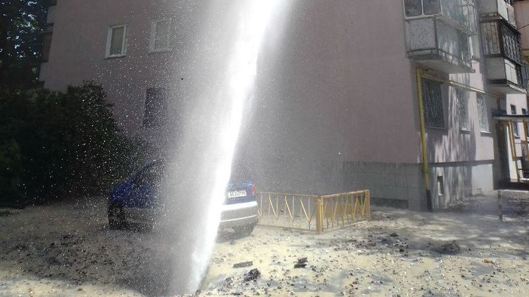 В субботу, 11 июля, в киевском микрорайоне Березняки произошел прорыв трубы. Струя холодной воды достигала верхнего этажа девятиэтажного дома.