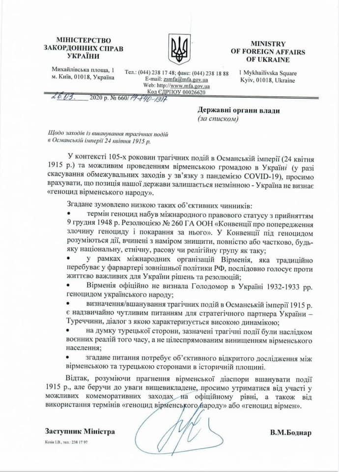 Замглавы МИД Украины, в частности, отмечал, что Киев не признаёт геноцид армянского народа, а то, что случилось с армянами в Османской империи в начале XX века, "не подпадает под определение "геноцид". Свою позицию Боднар мотивировал тем, что Армения находится в фарватере российской внешней политики, а тема геноцида весьма чувствительна для стратегического партнёра Украины - Турции.