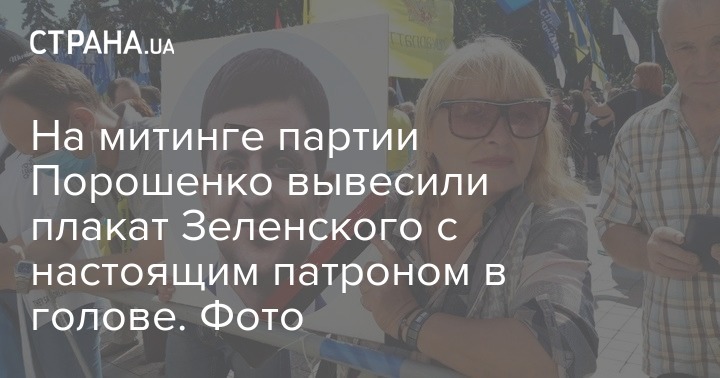 На митинг, организованный партией "Европейская солидарность" Петра Порошенко, который проходит под зданием Рады против законопроекта Максима Бужанского о языке, принесли плакат с изображением президента Украины Владимира Зеленского, изо лба которого торчит настоящий патрон.