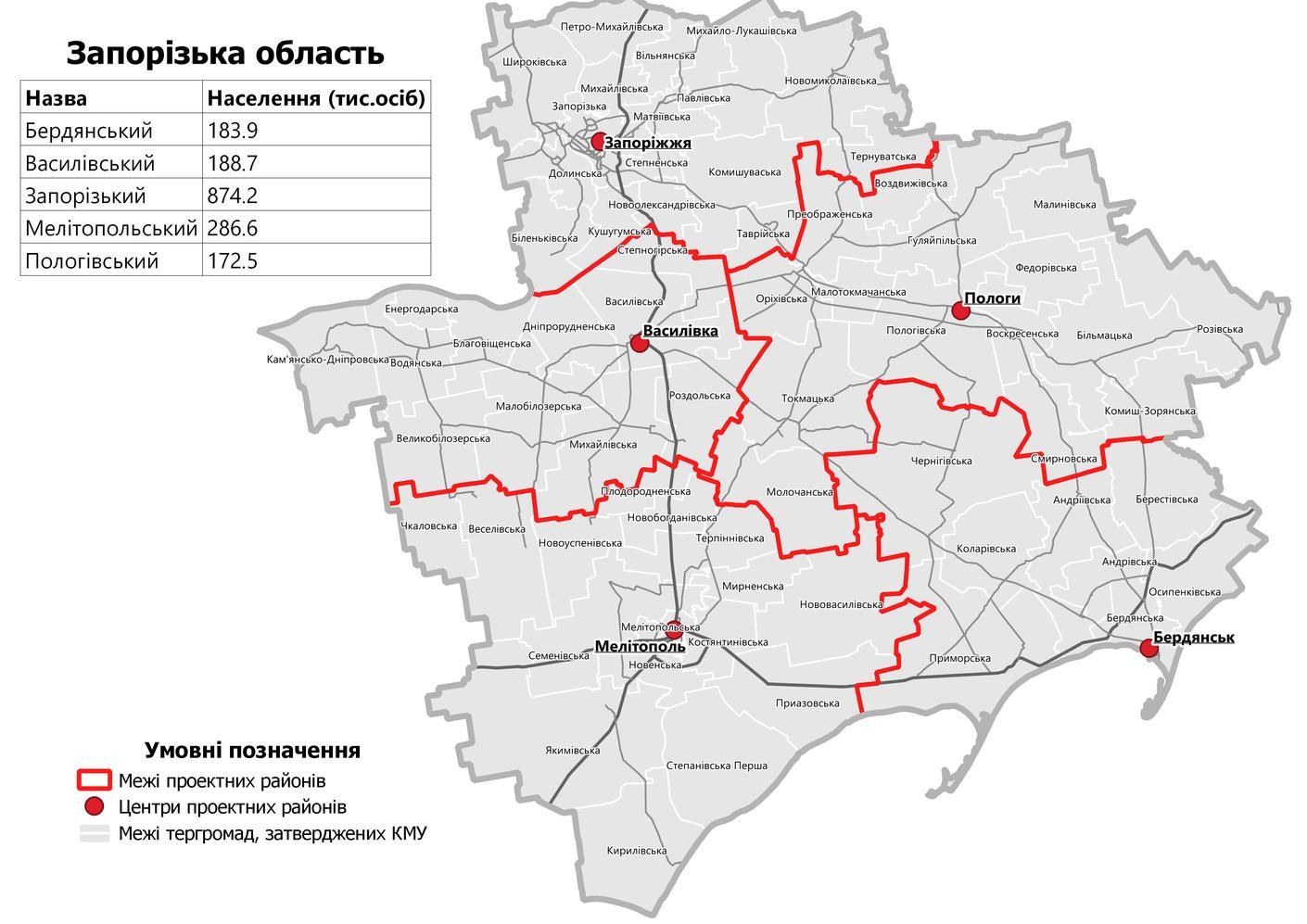 Пологовский район (с административным центром в городе Пологи) в составе территорий Бильмацкои поселковой, Воздвижевскои сельской, Воскресенской сельской, Гуляйпольской городской, Камыш-Зорянской поселковой, Малиновской сельской, Малотокмачанскои сельской, Молочанской городской, Ореховской городской, Пологовской городской, Преображенской сельской, Розовской поселковой, Смирновская сельской, Токмакской городской, Федоровской сельской территориальных общин;