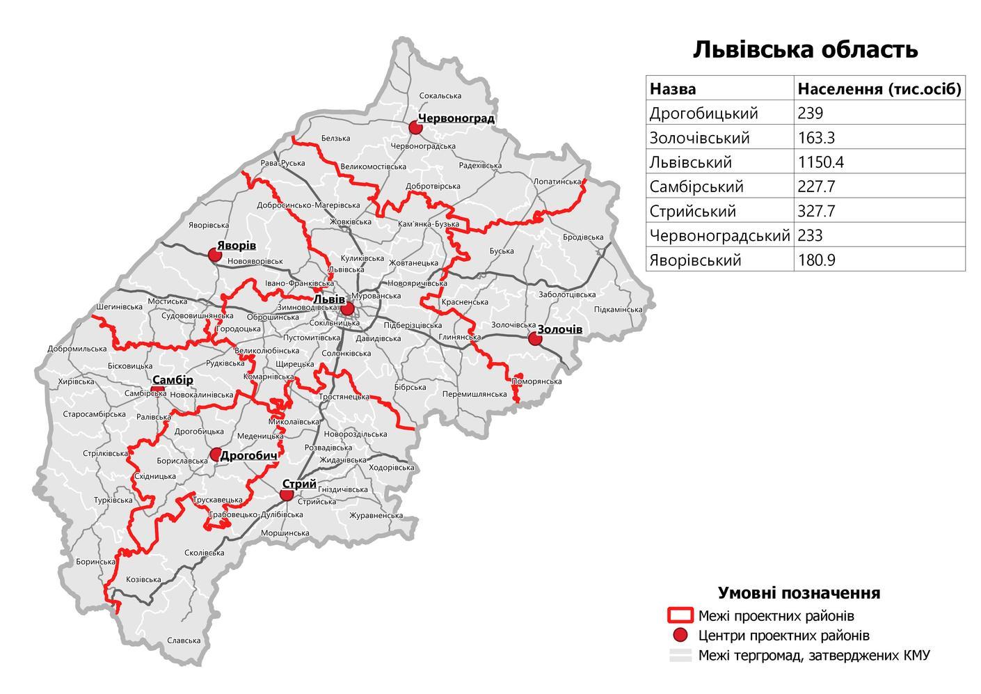 Львовский район (с административным центром в городе Львов) в составе территорий Бибрской городской, Великолюбинской поселковой, Глинянской городской, Городецкой городской, Давыдовской сельской, Добросинско-Магеровской поселковой, Жовкивской городской, Жовтанецкой сельской, Зимноводовскои сельской, Каменка-Бугской городской, Комарнивскои городской, Куликовской поселковой, Львовской городской, Муровановской сельской, Новояричовской поселковой, Оброшинской сельской, Перемышлянской городской, Пидберизцивькои сельской, Пустомытовской городской, Рава-Русской городской, Сокильницкои сельской, Соонковской сельской, Щирецкой поселковой территориальных общин;