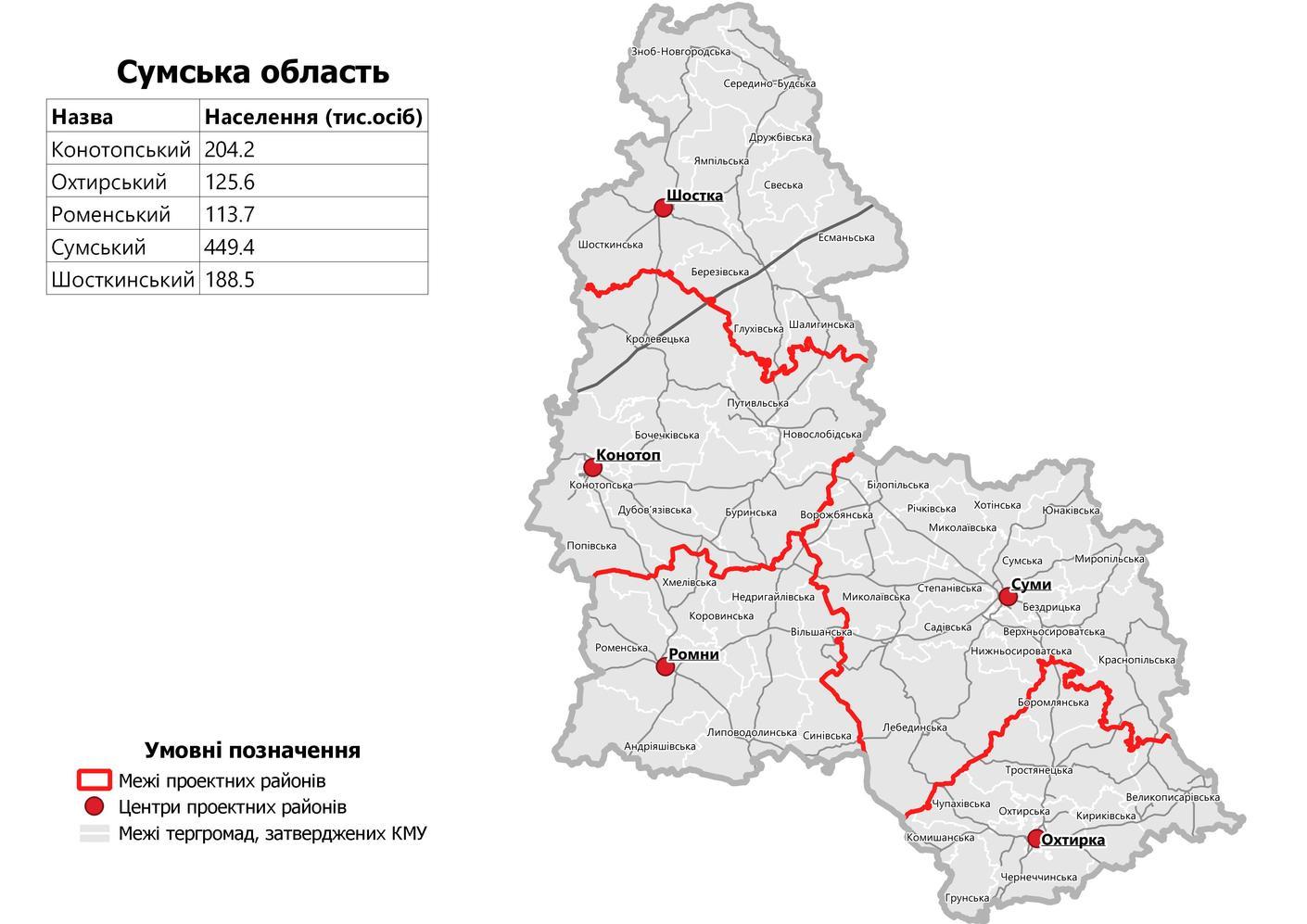 Сумской район (с административным центром в городе Сумы) в составе территорий Бездрицкои сельской, Верхнесироватскои сельской, Белопольской городской, Ворожбянской городской, Краснопольской поселковой, Лебединской городской, Николаевской поселковой, Николаевской сельской, Миропольской сельской, Нижнесыроватской сельской, Ричковской сельской, Садовской сельской, Степановской поселковой, Сумской городской, Хотинской поселковой, Юнакивскои сельской территориальных общин;