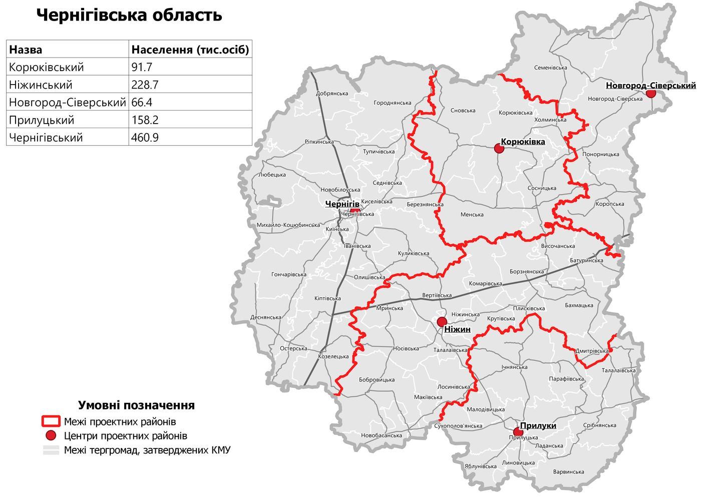Черниговский район (с административным центром в городе Чернигов) в составе территорий Березнянской поселковой, гончаровской поселковой, Городнянской городской, Деснянской поселковой, Добрянской поселковой, Ивановской сельской, Киенской сельской, Киселевской сельской, Киптивскои сельской, Козелецкой поселковой, Куликовской поселковой, Любечской поселковой, Михаил -Коцюбинскои поселковой, Новобелоуской сельской, Олишевской поселковой, Остерской городской, Репкинской поселковой, Седневской поселковой, Тупичевской сельской, Черниговской городской территориальных общин.