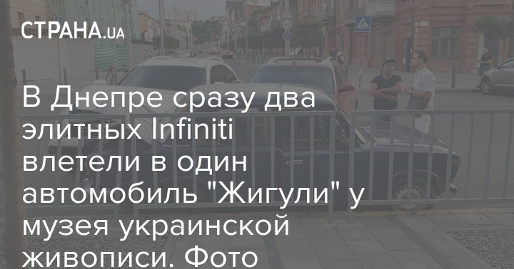 В Днепре произошло столкновение двух автомобилей марки Infiniti. "Поцеловавшись" друг с другом, дорогие машины влетели в припаркованный у обочины ВАЗ.