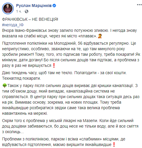 В понедельник досталось и Ивано-Франковску. Мощный ливень подтопил больницы, парк, вырвал крышки канализационных люков. Об этом написал городской голова Руслан Марцинкив.