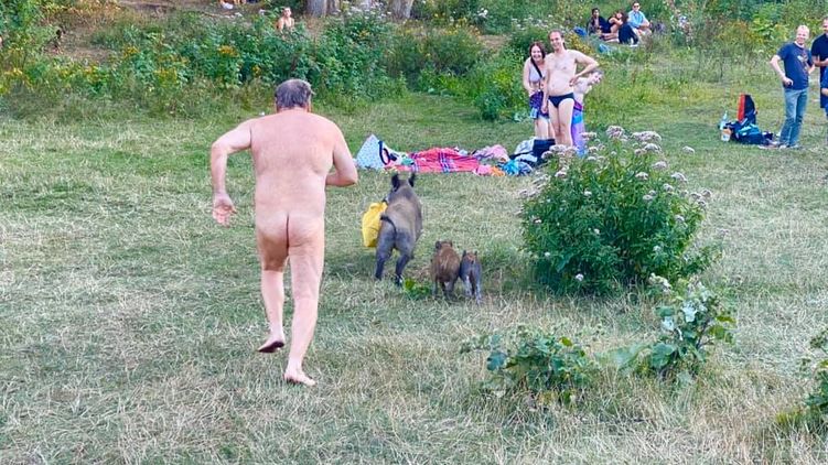 Кабан убегает от нудистаПогоня за вороватым зверем