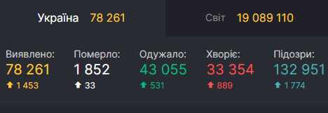 По состоянию на утро пятницы 7 августа, количество зараженных коронавирусом в Украине увеличилось на 1 453 человека. Это новый печальный антирекорд, причем вот уже третий день подряд. Общее число заболевших украинцев достигло отметки в 78 261 человек. Вчера, 6 августа, в стране насчитывалось в общей сложности 76 808 зараженных.