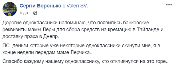 В посте знакомой погибшей Ольги Барановой говорится, что семья и друзья Леры в Тайланде выбрали компанию, которая будет сопровождать кремацию в Сурадж Тани. При этом предварительная стоимость услуг составит около 56000 бат. (около 50 тысяч грн.)