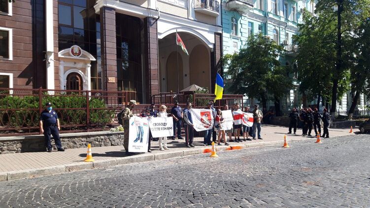 В пятницу, 14 августа, у посольства Беларуси в Киеве шестой день подряд проходит акция солидарности с протестующими в Беларуси.