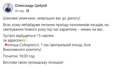 Сегодня мэр Умани Александр Цебрий заявил, что рассматривает возможность заблокировать въезды в город на период иудейского Нового года Рош Ха-Шана (18-20 сентября), чтобы предотвратить массовый приезд паломников. Также он сказал, что намерен встретиться с президентом Владимиром Зеленским, чтобы обсудить ситуацию.