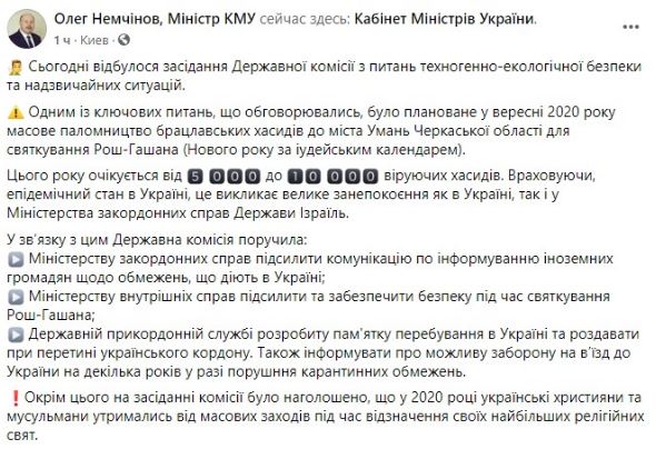 То есть, в посте Немчинова не было по сути никаких запретов на проведение паломничества. Хотя об этом просил даже Израиль. В минздраве страны ранее призвали Киев не позволять хасидам приезжать на праздник, видимо, опасаясь, что паломники привезут коронавирус из Украины из-за массовых скоплений людей во время праздника.