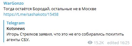 Позже Игорь Стрелков заявил, что его не похищали. Из чего WarGonzo делает вывод, что наиболее вероятная кандидатура - экс-премьер "ДНР" Александр Бородай, поскольку остальные находятся не в Москве.