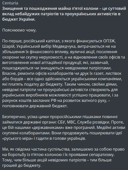 При этом близкая к "Нацкорпусу" организация "Центурия" вчера опубликовала в Телеграм пост о том, что "Уничтожение и повреждение имущества пятой колонны - это существенный вклад неравнодушных патриотов и проукраинских активистов в бюджет Украины". И "чем больше акций неизвестных патриотов - тем больше денег в бюджет".