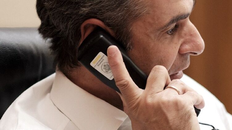 На трубке в руке Мицотакиса надпись "Предупреждение. Собственность правительства США. Государственный департамент Соединенных Штатов Америки" и номер.