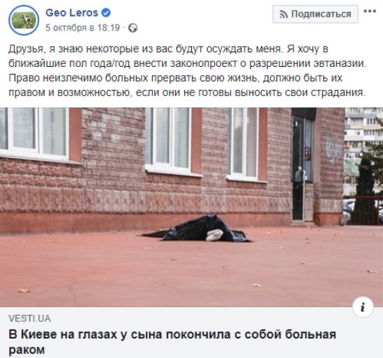 О потенциальном законопроекте депутат сообщил, комментируя новость о том, что в Киеве покончила с собой онкобольная женщина, выбросившись из окна. Отвечая на комментарий о том, как будет решаться вопрос с детской эвтаназией, нардеп написал, что перед тем как закон отправится в парламент, планируются широкие обсуждения.