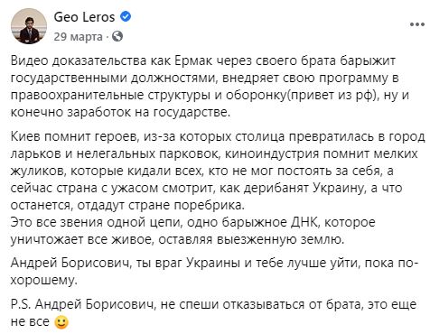 "Видеодоказательства, как Ермак через своего брата барыжит государственными должностями, внедряет свою программу в правоохранительные структуры и оборонку (привет из РФ), ну и, конечно, заработок на государстве", – написал Лерос на своей странице.