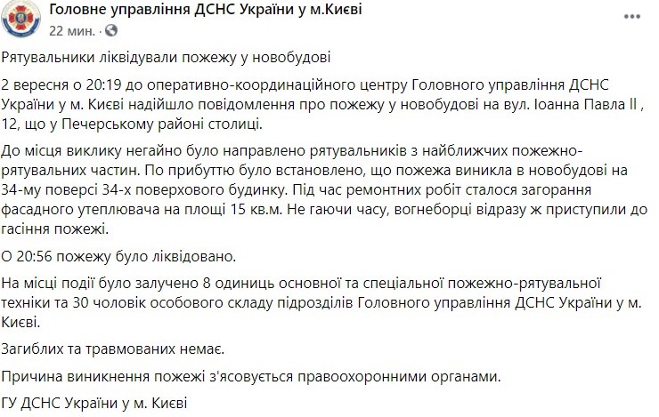 "2 сентября в ГСЧС поступила информация, что в Печерском районе по ул. Иоанна Павла II 12, в 35-этажной новостройке возник пожар на 34 этаже. К тушению пожара были привлечены 18 чел. о / с и 4 ед. техники. В 20:57 пожар был ликвидирован на площади 15 м кв.", - указано в сообщении.