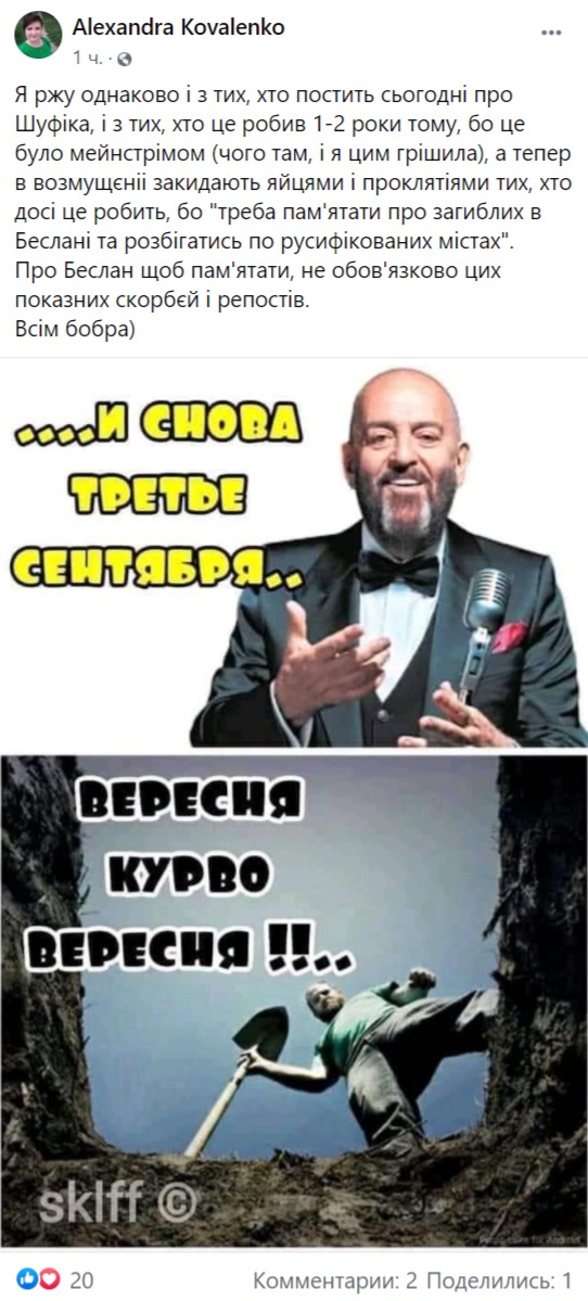 "Я ржу одинаково и с тех, кто постит сегодня про Шуфика, и с тех, кто это делал 1-2 года назад, потому что это было мейнстримом (чего там, и я этим грешила), а теперь в возмущении забрасывают яйцами и проклятиями тех, кто до сих пор это делает, потому что "надо помнить о погибших в Беслане и разбегаться по русифицированным городам".
