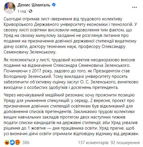 Премьер-министр Украины Денис Шмыгаль объяснил, что весь проект о назначении пожизненных стипендий педагогам, среди которых отец президента Украины Александр Зеленский, отозвали. Это сделано для того, чтоб дополнить списков стипендиатов. Их планируют наградить ко дню работника образования.