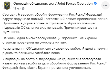 В тот же вечер 6 сентября ситуация стала накаляться снова. Штаб ООС заявил о первой боевой потере за время перемирия. Было сказано, что противник открыл прицельный огонь из стрелкового оружия по украинцам неподалеку от Причепиловки на Луганщине. В результате обстрела один военнослужащий погиб.