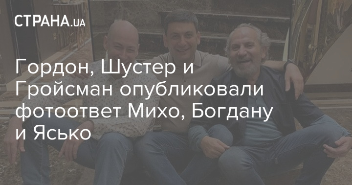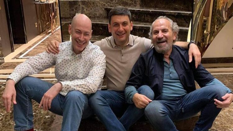 В сети появилось фото, на котором журналист Дмитрий Гордон, телеведущий Савик Шустер и похудевший экс-премьер Владимир Гройсман обнявшись сидят перед шляпой, в которой лежит денежная купюра. Над их головами в зеркалах отражаются фотографирующие их женщины. Снимок опубликован на странице Гордона в Instagram.