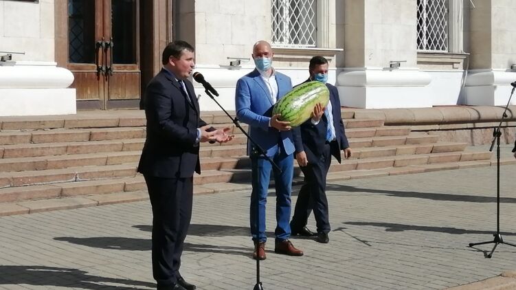 Шмыгалю преподнесли самый большой арбуз этого урожая. Фото: ukrinform.ua