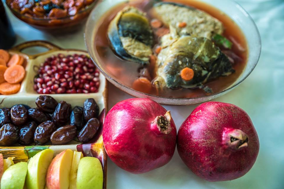 Существует ряд традиционных блюд - сладкая выпечка хала, мед, гранаты, рыба, которую подают целиком, нарезанная кружочками морковь. Все они символизируют разные достатки - сладкую жизнь, плодородие, изобилие или напоминают о заповедях, как гранат.