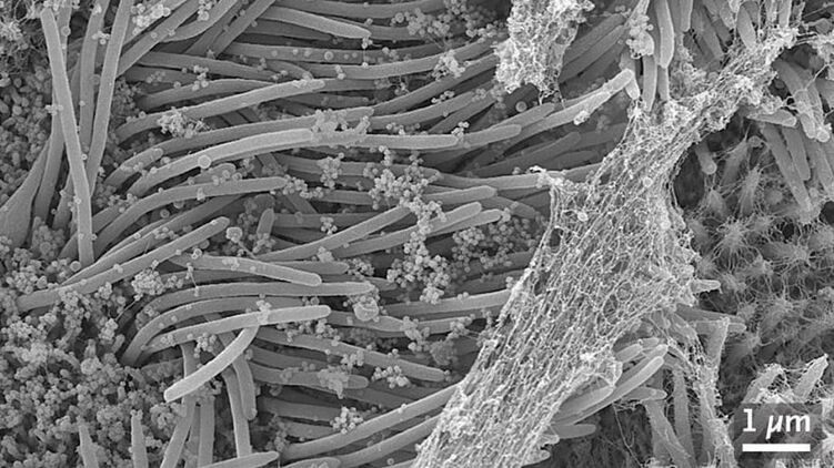 На фото видна зараженная ресничная клетка с нитями слизи на кончиках ресничек. При большем увеличении видна структура и плотность вирионов (полноценных вирусных частиц, состоящих из нуклеиновой кислоты и капсида) SARS-CoV-2, продуцируемых эпителиальными клетками дыхательных путей человека.