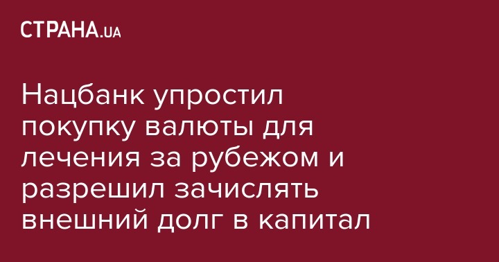 Нацбанк Украины (НБУ) упростил процедуру покупки валюты для оплаты лечения заграницей, а также разрешил компаниям-резидентам зачислять сумму внешнего долга в собственный капитал. Наряду с этим приняты и ряд других новаций на валютном рынке, сообщает Интерфакс.
