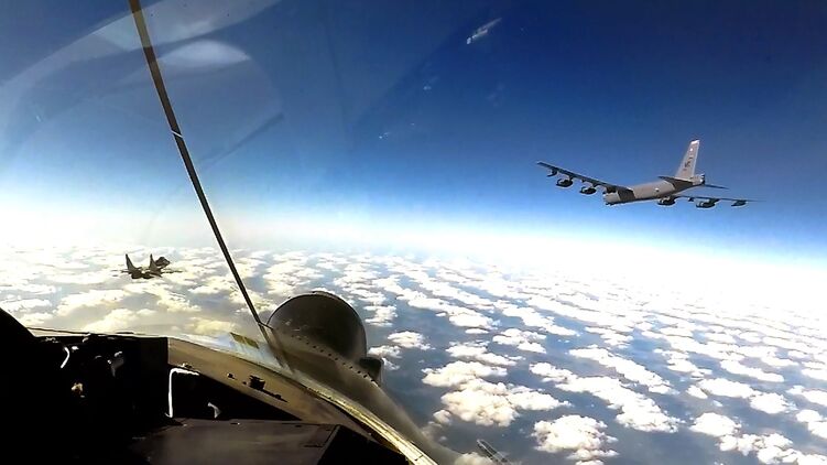 "В-52 под прикрытием украинских истребителей взяли курс на акваторию Черного моря для совместных действий с партнерами в сфере коллективной безопасности. Такие патрулирования будут иметь регулярный характер, ведь миссия В-52 в небе Украины является частью давно запланированного развертывания шести B-52 на авиабазе Ферфорд Королевских Военно-воздушных сил Великобритании", - отметили в пресс-службе.