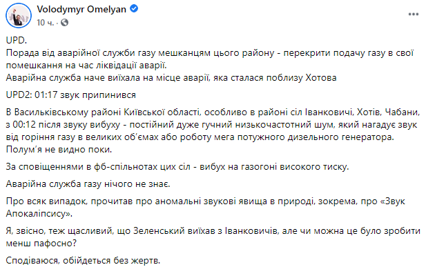 Первые сообщения о взрыве газа в поселке под Киевом появились после полуночи. Певица Гайтана, которая живет в расположенном неподалеку коттеджном комплексе "Маеток" (именно там был дом Зеленского, который он продал), опубликовала сообщение в соцсети. Она сообщила, что в ее доме дрожат окна и звук такой, как будто упал самолет.