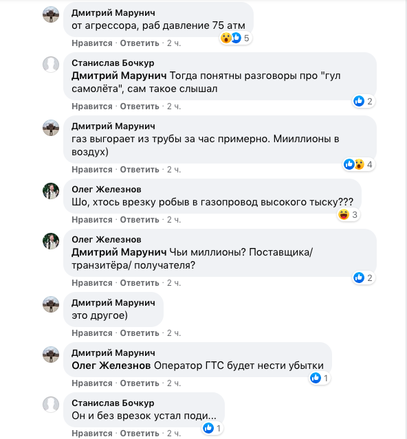 В комментариях Марунич добавил, что в результате аварии в воздух ушли миллионы. Также он пишет, что газопровод был заполнен российским газом.
