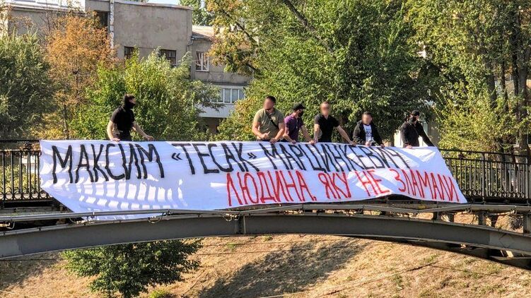 Так, на Зоологическом мосту в Харькове радикалы вывесили плакат с текстом "Максим "Тесак" Марцинкевич - Человек, которого не сломали" и зажгли файеры.