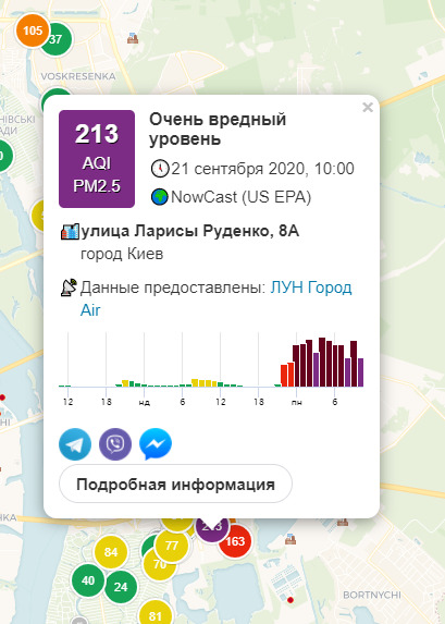 По состоянию на 10:30 наиболее грязный воздух датчики фиксируют на Харьковском массиве (152), в районе Харьковского шоссе (153), 11-й район Осокорков (163), 6-й "А" микрорайон Позняков (168), 9-й район Осокорков (213).