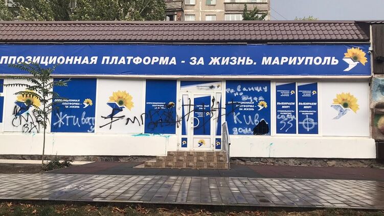 Неизвестные в балаклавах совершено нападение на региональную общественную приемную партии "Оппозиционная платформа - За жизнь" в Мариуполе. Инцидент произошел в ночь на 30 сентября. Группа злоумышленников расписала краской и залили зеленкой стены приемной, разбила окна, а так же изрисовали фасад свастикой, эсэсовскими символами и оскорбительными надписями.