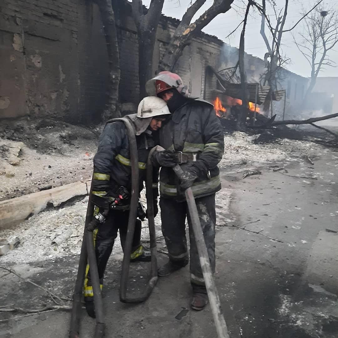 Тушить пламя прибыли пожарные из соседней Харьковской области. Их фото публикуют местные группы в соцсетях. Видно, что люди работали всю ночь и очень устали. Они тушили пожар в самом Северодонецке.