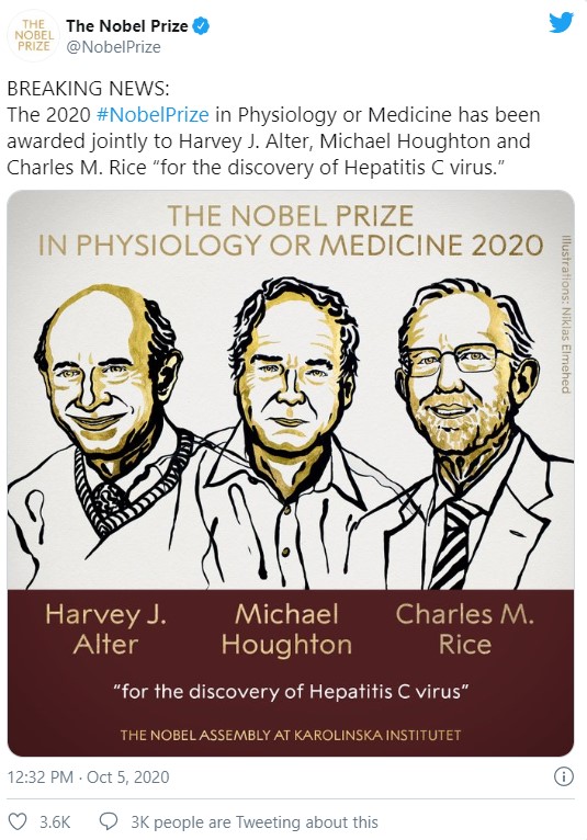 В понедельник, 5 октября, прошло вручение Нобелевской премии в области физиологии и медицины за 2020 год. Лауреатами стали Харви Альтер, Майкл Хоутон и Чарльз Райс, которые открыли вирус гепатита С.