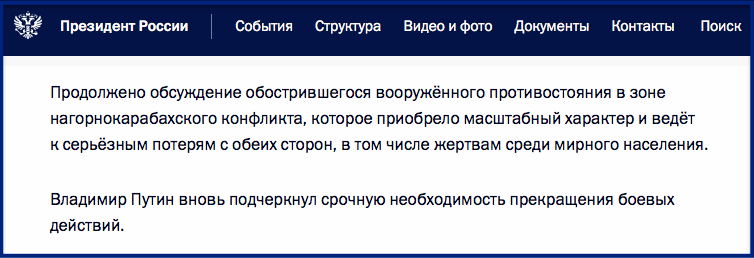 В Кремле указывают, что нагорнокарабахский конфликт приобрел масштабный характер и ведет к серьезным потерям с обеих сторон, в том числе жертвам среди мирного населения. В связи с этим Путин подчеркнул "срочную необходимость прекращения боевых действий".