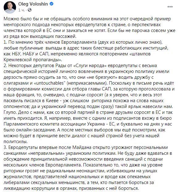 2. Некоторых депутатов Рады от "Слуги народа" евродепутаты с весьма специфической историей личного вовлечения в украинскую политику имели дерзость прямо осудить за то, что они "не брезгуют" водить дружбу с олигархами и "untouchables" (неприкасаемыми). Поскольку в письме речь идёт о формировании комиссии для отбора главы САП, за которую проголосовала и наша фракция, то, очевидно, с подачи соросят (а я уверен, что и весь этот пасквиль писался в Киеве - уж слишком риторика похожа на слова наших оппонентов; да и украинский перевод подан сразу) такой ярлык навесили нам. Глупо. Дело с нами, как со второй партией в стране друзьям соросят в ЕС и так иметь приходится. Я, например, вместе с одним из подписантов вхожу в бюро Парламентского комитета ассоциации Украина - ЕС, и буквально на днях у нас было онлайн-заседание. А после местных выборов мы ещё посмотрим, как можно будет в принципе вести диалог с нашей страной без учета нашей политсилы.