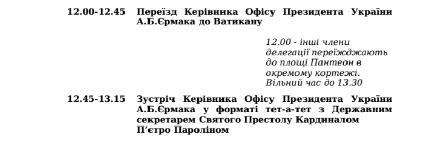 Однако, по информации издания "Зеркало недели", после двух получасовых встреч в МИД Италии, Ермак отправился в Ватикан на встречу в формате тет-а-тет с кардиналом Пьетро Паролин. Остальные члены делегации в это время знакомились с местными достопримечательностями на площади Пантеон.