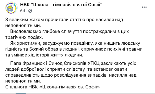 "С огромным ужасом сообщество школы прочитало статью о насилии над несовершеннолетними. Выражаем глубокое соболезнование жертвам этих трагических событий. Как христиане, осуждаем поведение, уничтожающее человеческое достоинство и образ Божий в человеке, вызывающее психические травмы на всю жизнь и меняющее ход жизни человека. Папа Франциск и Синод Епископов УГКЦ призывают всех людей доброй воли содействовать следствию и устанавливать справедливость по расследованию случаев насилия над несовершеннолетними", - говорится в сообщении на странице школы в Фейсбуке.
