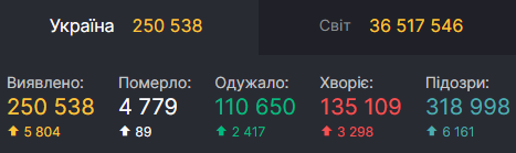 По состоянию на утро пятницы, 9 октября, в Украине подтвердилось еще 5 804 новых случая заражения коронавирусом. Общее число заболевших таким образом достигло отметки в 250 538 человек. И это снова печальный антирекорд. Предыдущий был установлен вчера, 8 октября, когда было выявлено 5 397 новых зараженных.
