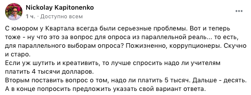 "С юмором у Квартала всегда были серьезные проблемы. Вот и теперь тоже - ну что это за вопрос для опроса из параллельной реаль... то есть, для параллельного выборам опроса? Пожизненно, коррупционеры. Скучно и старо.
