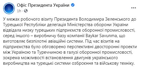 "В рамках рабочего визита президента Владимира Зеленского в Турецкую Республику делегация Министерства обороны Украины посетила ряд турецких предприятий оборонной промышленности, в том числе - производственную базу компании Baykar Savunma, которая производит беспилотные авиационные системы", - говорится в сообщении.