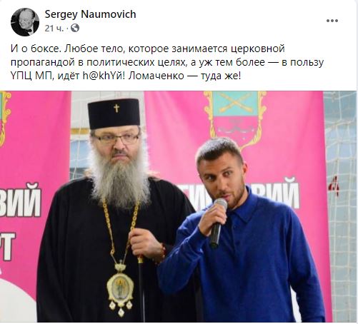 "И о боксе. Любое тело, которое занимается церковной пропагандой в политических целях, а уж тем более — в пользу YПЦ МП, идёт h@khYй! Ломаченко — туда же!" - написал блогер Сергей Наумович.