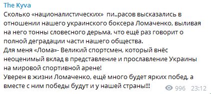 "Сколько "националистических" пи..расов высказались в отношении нашего украинского боксера Ломаченко, выливая на него тонны словесного дерьма, что ещё раз говорит о полной деградации части нашего общества.