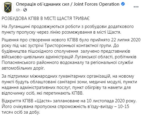 Новое КПВВ "Счастье" на Луганщине откроют 10 ноября - штаб ООС