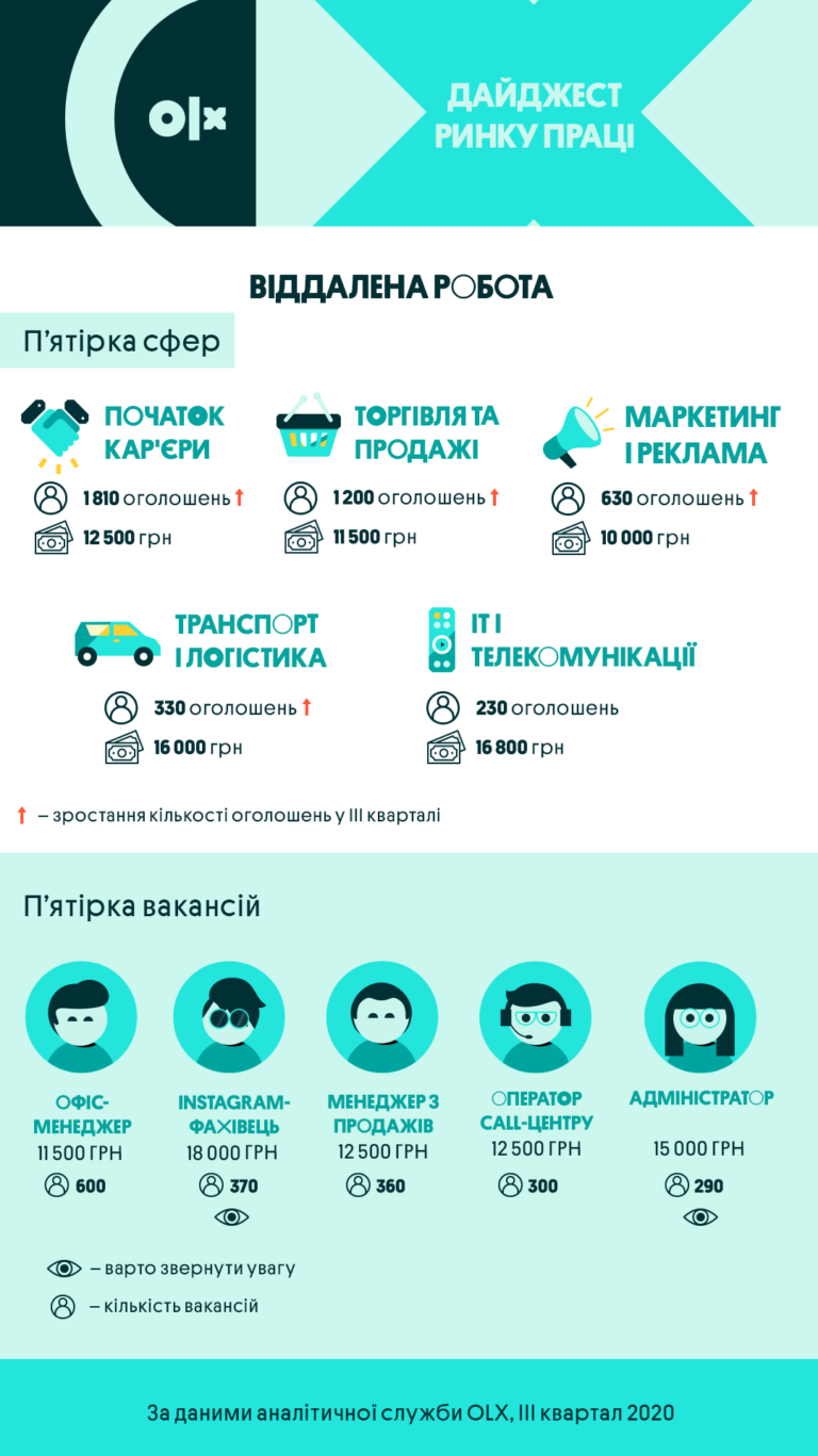 Так, наиболее активными при поиске оказались молодые люди, который находятся на старте карьеры: на одну удаленную вакансию, которых в третьем квартале было 1,8 тыс, откликается в среднем 21 кандидат. Средний уровень дохода - 12 500 грн.